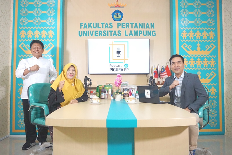 Universitas Lampung Fakultas Pertanian melalui Prof. Dr. Ir. Sri Hidayati, S.T.P., M.P. (Guru Besar Jurusan Teknologi Hasil Pertanian FP Unila) menggelar acara Podcast Pigura (Pertanian Inspirasi Penggerak Nusantara) dengan topik Pengolahan Hasil Perkebunan Lampung, acara dipandu oleh Duryat, S.Hut,.M.Si. diruang podcast FP Unila, Senin 18 Desember 2023.