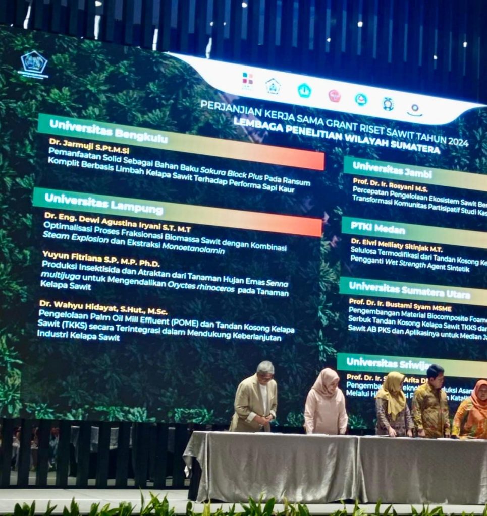 Fakultas Pertanian Unila mendapatkan kepercayaan untuk melaksanakan penelitian yang didanai dalam program ini dengan judul penelitian “Pengelolaan Palm Oil Mill Effluent (POME) dan Tandan Kosong Kelapa Sawit (TKKS) secara Terintegrasi dalam Mendukung Keberlanjutan Industri Kelapa Sawit” yang diketuai oleh Dr. Wahyu Hidayat, S.Hut., M.Sc., dengan anggota penelitian terdiri dari Prof. Dr. Ir. Agus Haryanto, M.P., Dr. Eng. Dewi Agustina Iryani, S.T., M.T. Dr. Melya Riniarti, S.P., M.Si., Dr. Hendra Prasetia, S.Hut., M.Sc., dan Intan Fajar Suri, S.Hut., M.Sc.