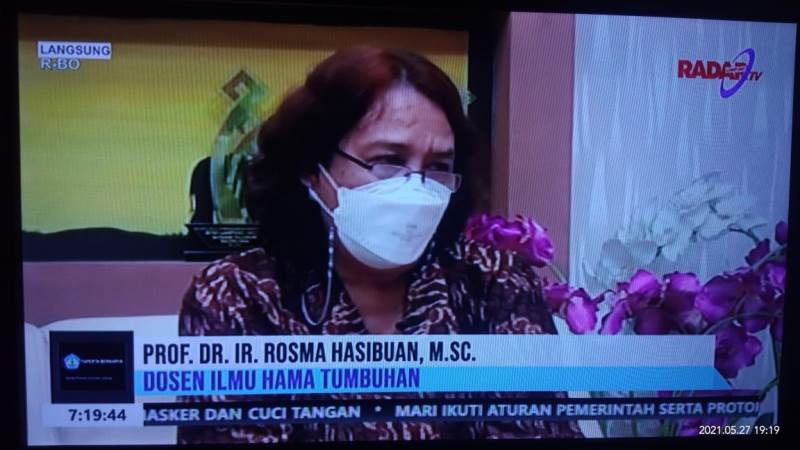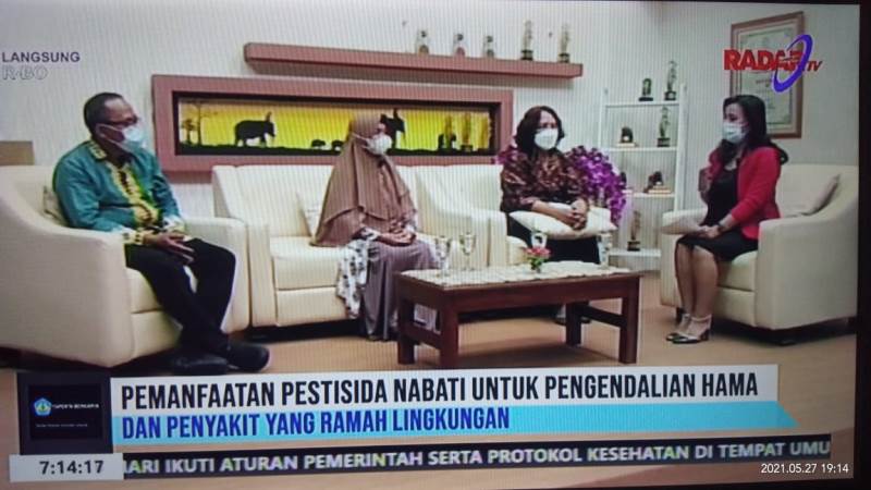 Jurusan Proteksi Tanaman Fakultas Pertanian Universitas Lampung (FP Unila) melalui Prof. Dr. Ir. Rosma Hasibuan, M.Sc. (Dosen Ilmu Hama Tumbuhan), Ir. Lestari Wibowo, M.P. (Dosen Ilmu Hama Tumbuhan), dan Ir. Joko Prasetyo, M.P. (Dosen Ilmu Penyakit Tumbuhan), dalam siaran Faperta Berkarya dengan topik Pemanfaatan Pestisida Nabati untuk Pengendalian Hama dan Penyakit yang Ramah Lingkungan, bertempat di radal lampung Televisi, Kamis (27/05/2021).