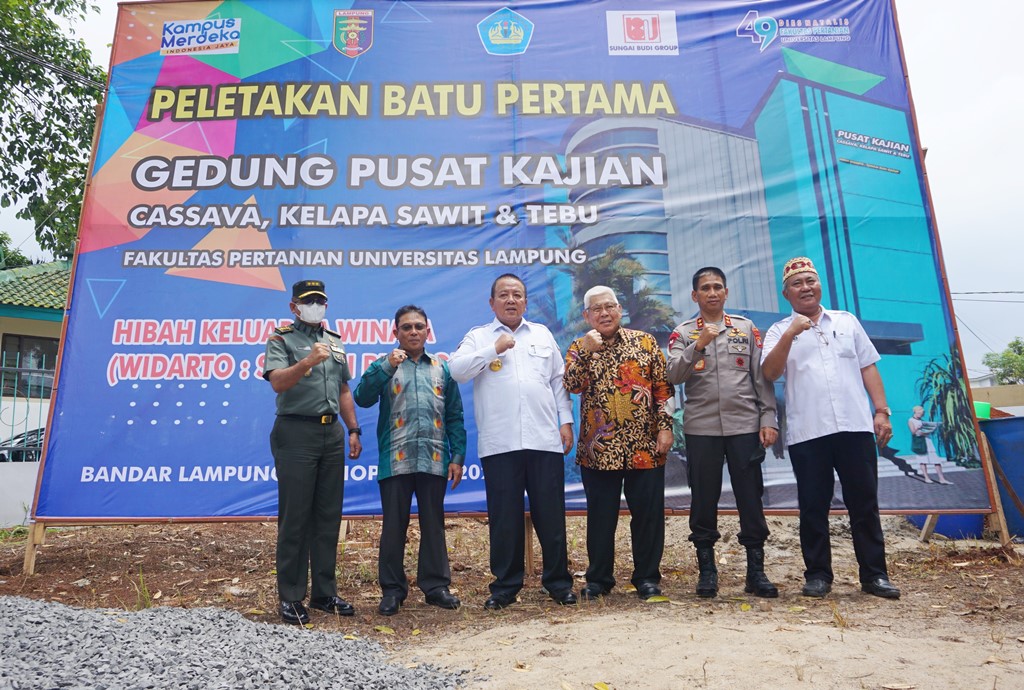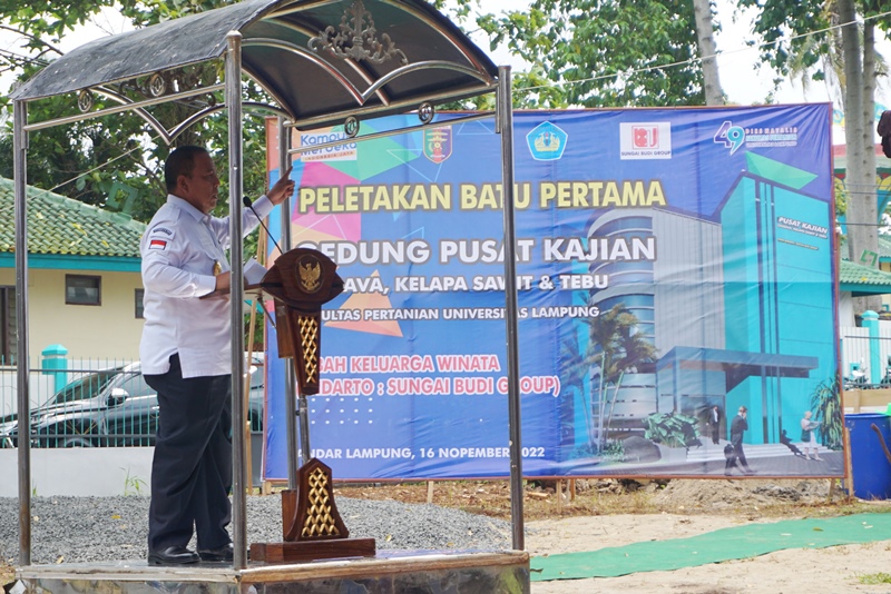 Dekan FP Unila Prof. Dr. Ir. Irwan Sukri Banuwa, M.Si., menyampaikan bahwa Gedung Pusat Kajian Cassava, Kelapa Sawit, dan Tebu yang akan dibangun adalah merupakan hibah dari keluarga Bapak Winata melalui Bapak Widarto dari Sungai Budi Group.