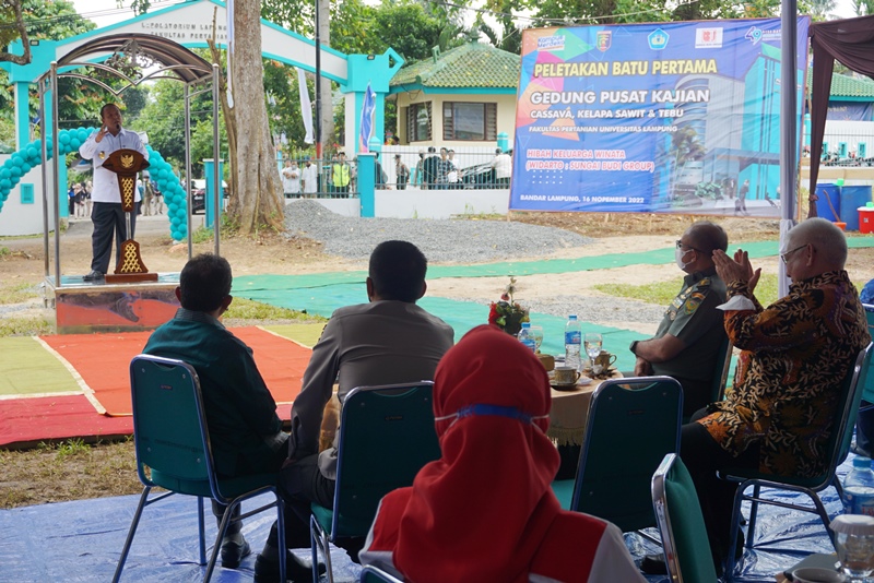 Fakultas Pertanian Universitas Lampung (FP Unila) dalam rangka merayakan hari jadinya yang ke-49 menggelar acara Peletakan Batu Pertama (groundbreaking) Gedung Pusat Kajian Cassava, Kelapa Sawit, dan Tebu di Laboratorium Lapangan Terpadu FP Unila, Rabu 16 November 2022.