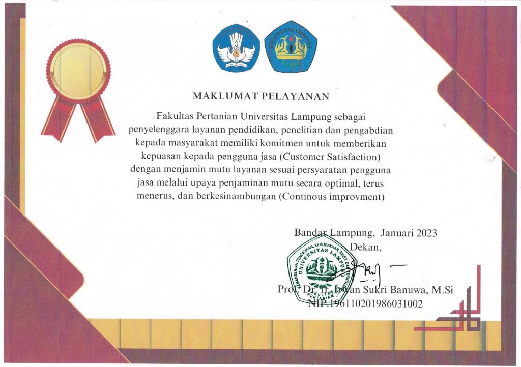 Fakultas Pertanian Universitas Lampung sebagai penyelenggara layanan pendidikan, penelitian, dan pengabdian kepada masyarakat memiliki komitmen untuk memberikan kepuasan kepada pengguna jasa (Customer Satisfication) dengan menjamin mutu layanan sesuai persyaratan pengguna jasa melalui upaya penjaminan mutu secara optimal, terus menerus, dan berkesinambungan (Continous Improvment), Bandar Lampung, Januari 2023.