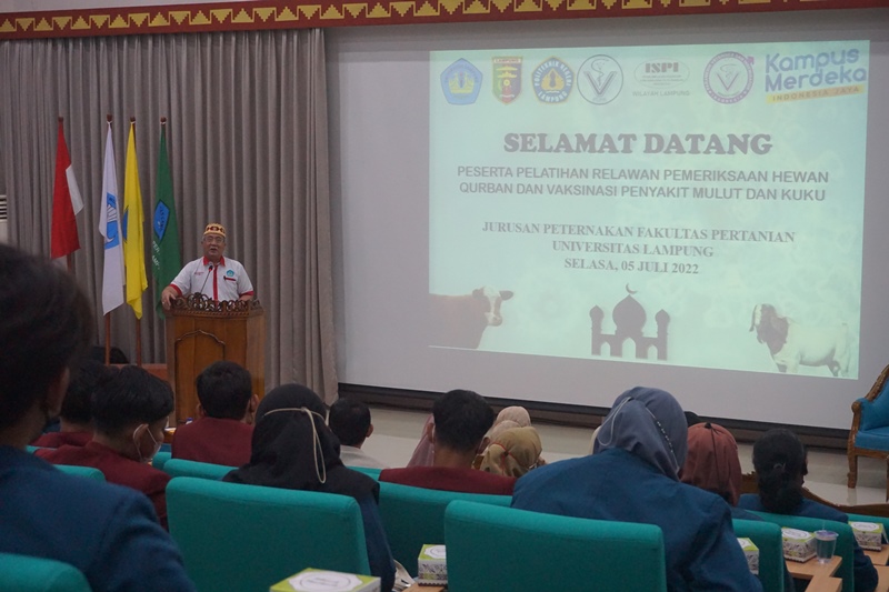 Fakultas Pertanian Universitas Lampung (FP Unila) jurusan Peternakan (PTK FP Unila) menyelenggarakan Pelatihan Relawan Pemeriksaan Hewan Qurban dan Vaksinasi Penyakit Mulut dan Kuku (PMK), Selasa 5 Juli 2022 diruang A1 dekanat FP Unila.