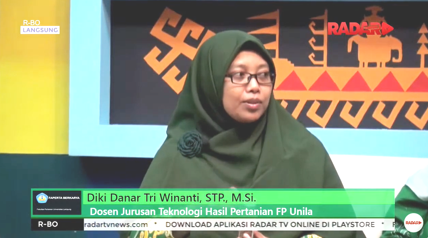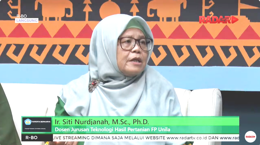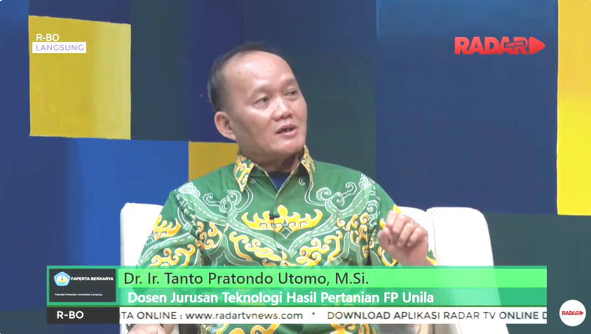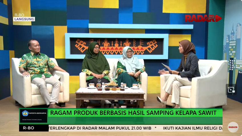 Universitas Lampung (Unila) Fakultas Pertanian (FP) Jurusan Teknologi Hasil Pertanian (THP) menggelar program siaran Faperta Berkarya dengan topik Ragam Produk Berbasis Hasil Samping Kelapa Sawit, oleh narasumber Ir. Siti Nurdjanah, M.Sc., Ph.D., Dr. Ir. Tanto Pratondo Utomo, M.Si., dan Diki Danar Tri Winanti, STP., M.Si., Kamis 11 Januari 2024 di Radar Lampung Televisi.