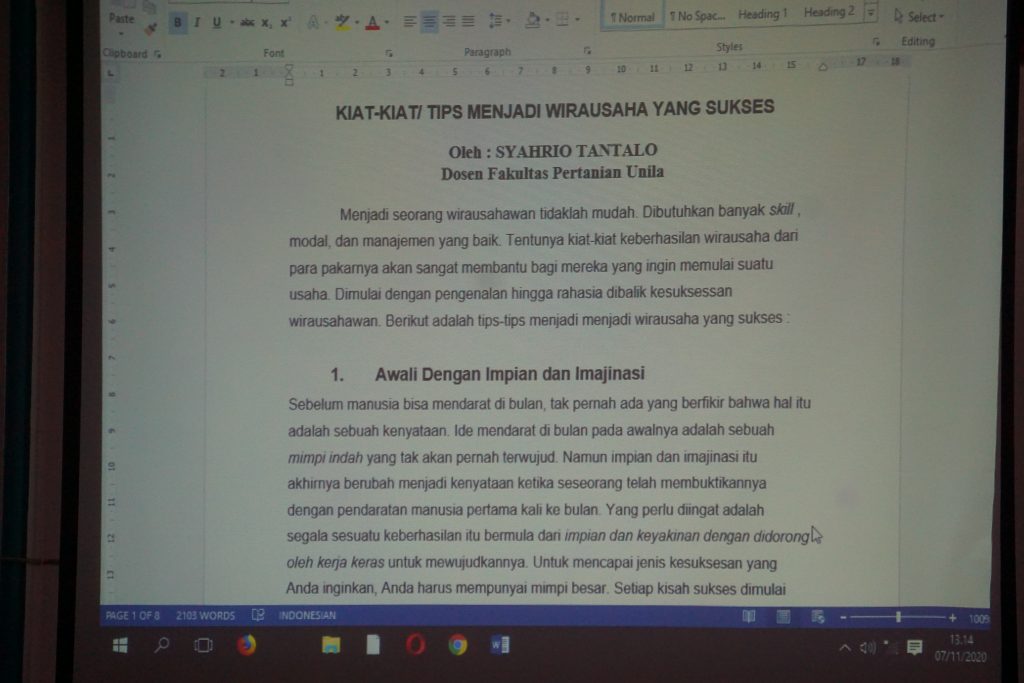 Dari 128 orang mahasiswa yang hadir 90 orang mengikuti workshop materi tentang kewirausahan dan program kreativitas mahasiswa (PKM), dilaksanakan pukul 08.00-15.30 WIB, Minggu (08/11/2020), narasumber oleh;